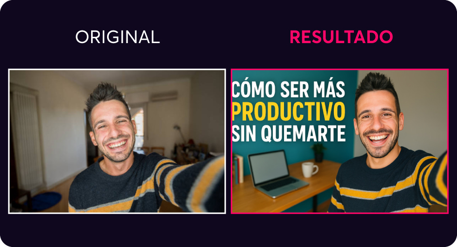 Prompt + imagen: Crea una miniatura para un video de YouTube sobre hábitos de productividad. Fondo interior tipo home office con escritorio, laptop y taza de café. Persona sonriente en primer plano, como si fuera una selfie, mirando a cámara. Incluye texto visible: ‘Cómo ser más productivo sin quemarte’. Colores vibrantes, composición clara.