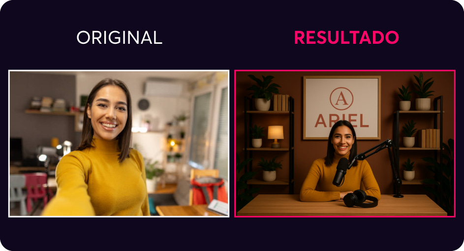 Prompt + imagen: Diseña el fondo ideal para un set de grabación de podcast de marca personal para esta persona (inluye a la persona de la foto). Estética: creativa, pero profesional. Elementos: estanterías, plantas, iluminación cálida, logo o cuadro, micrófono visible. Estilo tipo estudio moderno y femenino.