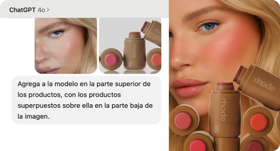 Prompt: “Agrega a la modelo en la parte superior de los productos, con los productos superpuestos sobre ella en la parte baja de la imagen.”
