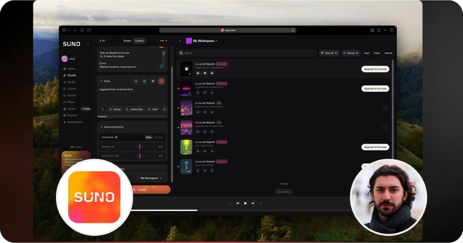 Describe género, tempo y referencias, y obtén pistas listas para usar, editar o compartir. Incluye estructuras, letras y stems para proyectos reales.