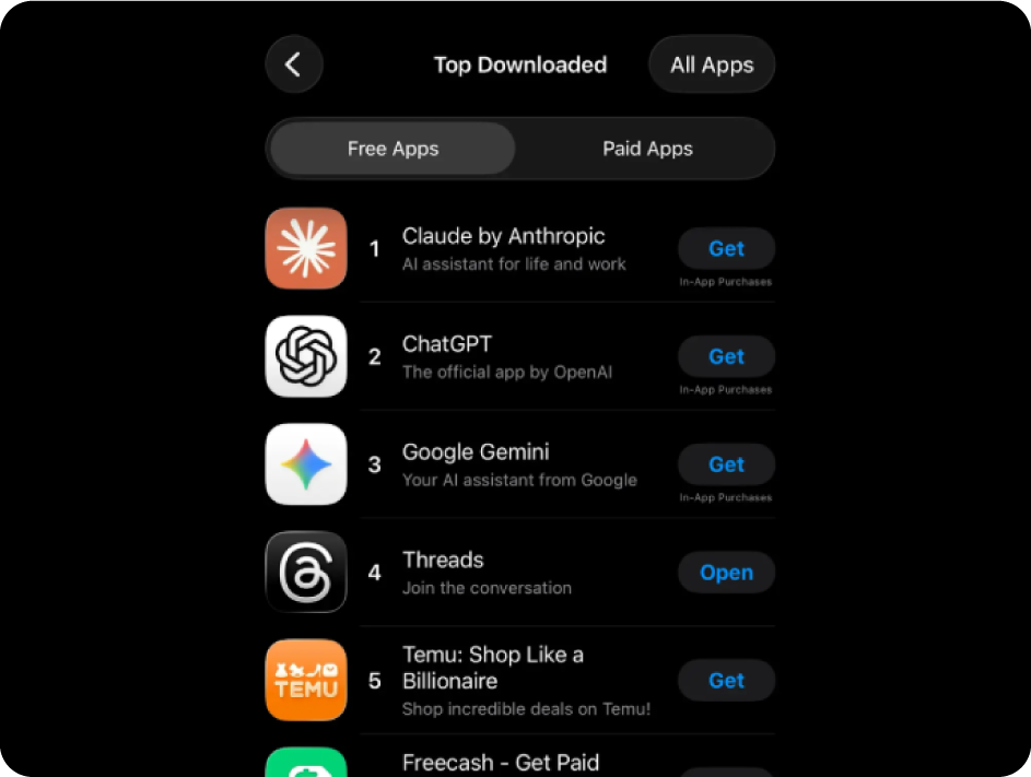 El efecto se vio también en el ranking y en las reseñas: Claude llegó al #1 del App Store en USA el sábado y, según Appfigures, superó por primera vez a ChatGPT en descargas diarias.