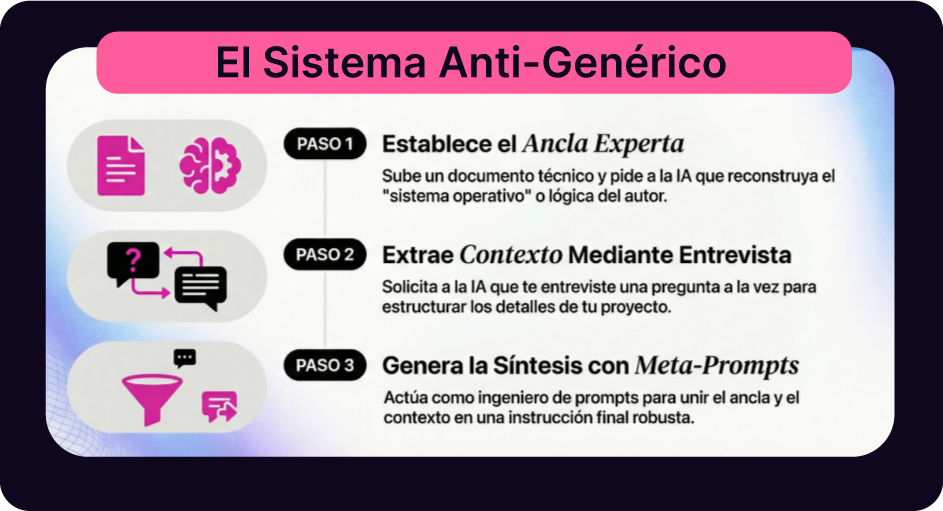 El error más común es pedirle a la IA que invente un plan desde cero. El resultado siempre será “el promedio”. La solución es Anclaje, u obligar a la IA a basarse en un marco de trabajo probado.