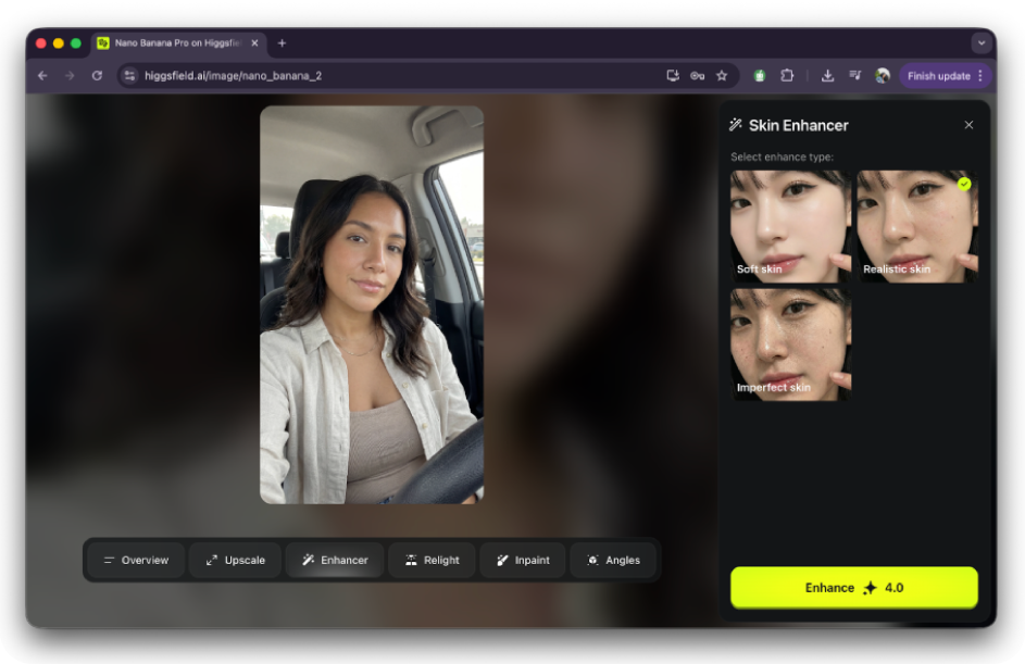 Tip: Si usas Nano Banana Pro dentro de Higgsfield, puedes activar Skin Enhancer para recuperar textura (poros, micro-imperfecciones) cuando la piel te salga demasiado “perfecta”.