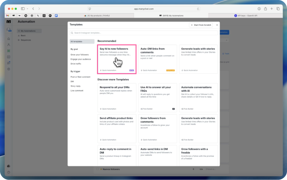 Entra a Manychat → conecta tu cuenta de IG. Habilita Instagram Automation. Crea un flow nuevo y elige la nueva opcion “Say hi to new followers”