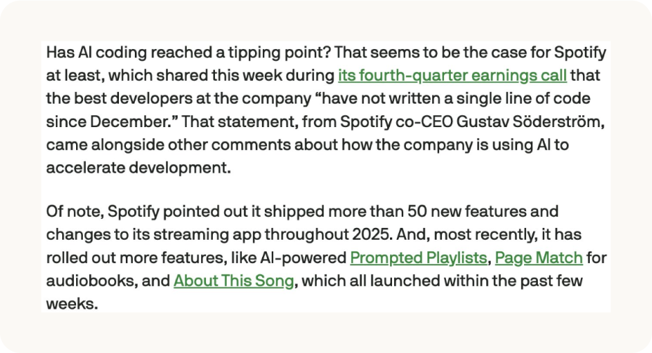 En su llamada de resultados Q4, el co-CEO de Spotify reveló que algunos de sus desarrolladores principales llevan meses sin escribir código directamente.