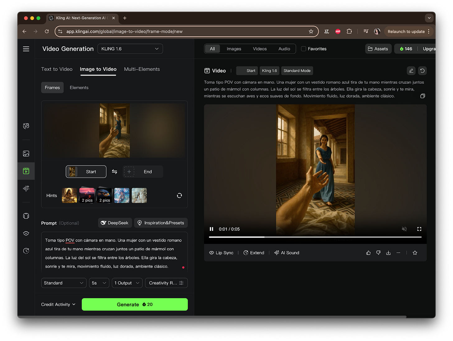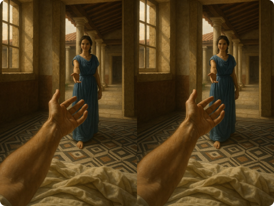 Prompt para Kling: Toma tipo POV con cámara en mano. Una mujer con un vestido romano azul tira de tu mano mientras cruzan juntos un patio de mármol con columnas. La luz del sol se filtra entre los árboles. Ella gira la cabeza, sonríe y te mira, mientras se escuchan aves y ecos suaves de fondo. Movimiento fluido, luz dorada, ambiente clásico.