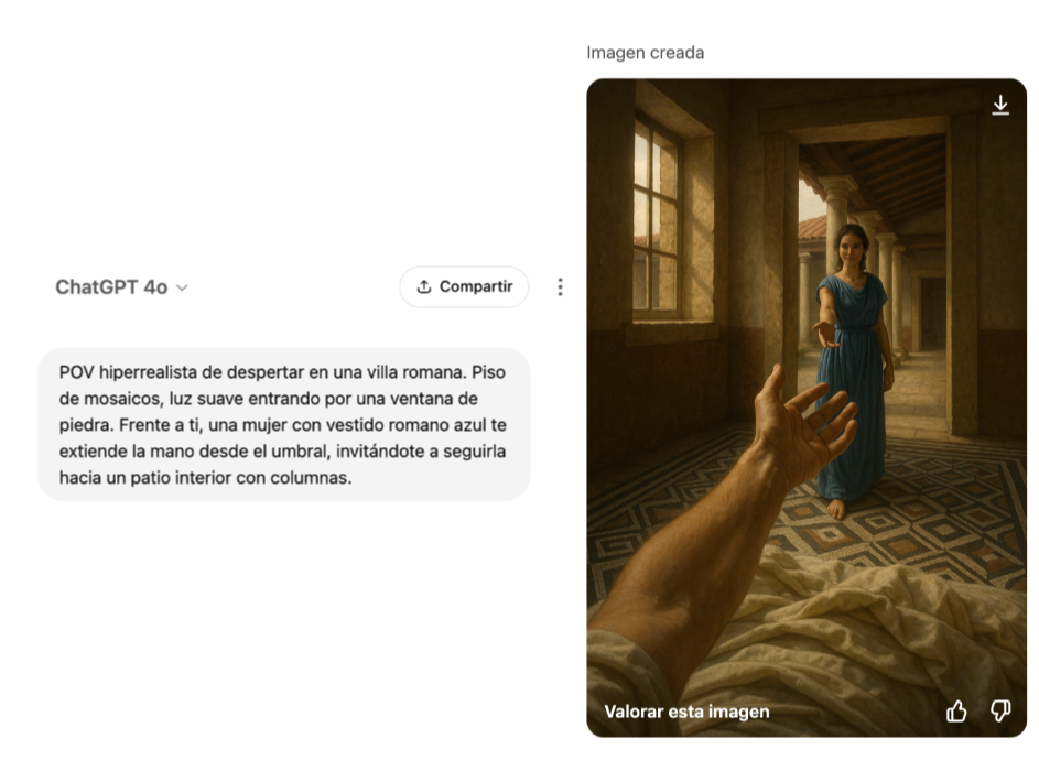 El primer paso es generar una imagen realista desde tu punto de vista. Para eso, puedes usar el generador de imágenes de ChatGPT (modelo 4o). El truco está en que la imagen parezca tomada desde tus propios ojos.