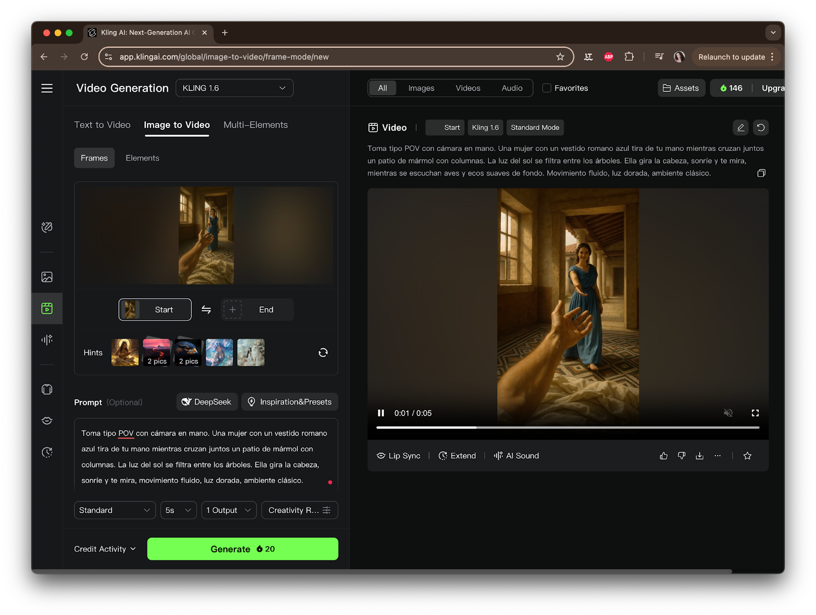 Kling: es una excelente opción para animar imágenes estáticas con efecto de cámara en mano. La versión gratuita permite generar hasta 5 segundos por video, con 66 créditos diarios para probar sin gastar. Ideal si quieres darle movimiento realista a una escena sin complicarte con herramientas de edición complejas.