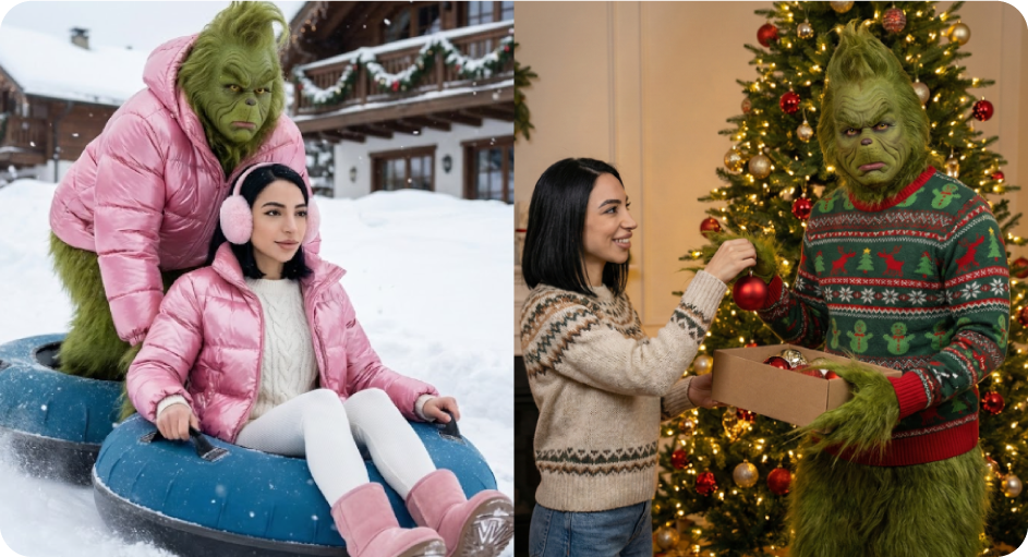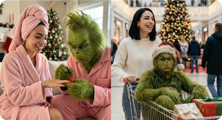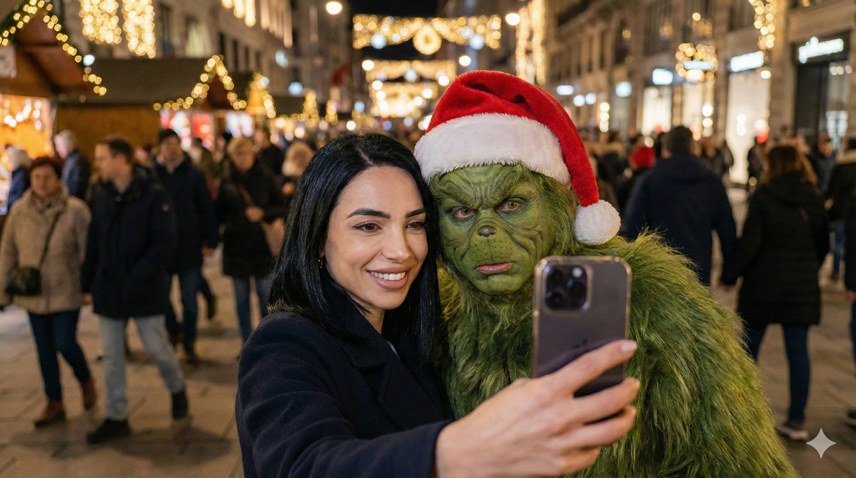Usa esta imagen adjunta como la ÚNICA referencia de rostro humano (FACE LOCK activo): conserva exactamente el rostro, expresión natural, proporciones y textura real de la piel, sin modificar ni embellecer. Genera una foto ultra realista estilo smartphone nocturno en formato 4:5. La escena ocurre en una calle urbana decorada con luces navideñas, con un fondo nocturno desenfocado lleno de bokeh cálido y ambiente festivo real. La composición es un selfie en primer plano: la persona sonríe mirando directamente a cámara mientras sostiene el teléfono con el brazo extendido. El Grinch aparece muy cerca, invadiendo ligeramente el encuadre, mirando a cámara con una expresión seria o incómoda, como si no entendiera cómo funciona un selfie. El Grinch debe verse hiperrealista, como un personaje interpretado con maquillaje y prótesis cinematográficas (no animado, no cartoon, no CGI), con pelaje verde detallado y natural, usando un gorro navideño o bufanda realista. Iluminación combinada: luz cálida proveniente de las luces navideñas del entorno y una iluminación frontal suave tipo pantalla de celular que ilumina el rostro de forma natural. Outfit de la persona: abrigo elegante de noche. Estilo visual casual, espontáneo y moderno, estética de redes sociales, profundidad de campo ligera típica de cámara de celular, fotografía realista en calidad 4K tipo smartphone.Así queda tu foto: