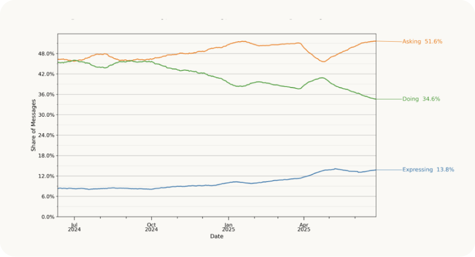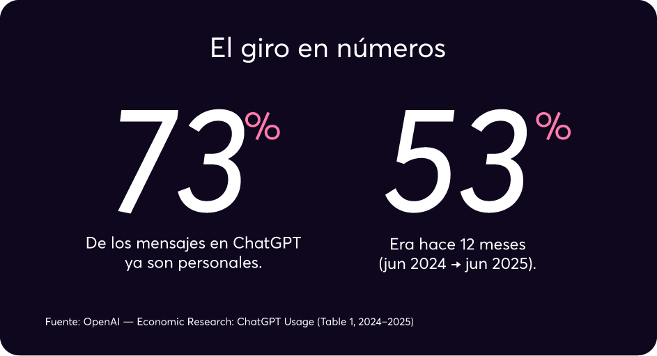¿Qué entra en “personal”? Pedir consejo, resolver dudas rápidas, comparar opciones, aprender algo puntual. Ese giro explica el resto del mapa; la IA está acompañando microdecisiones del día a día, no solo tareas de oficina.