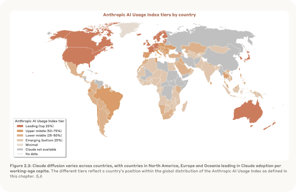 A nivel geográfico, ChatGPT se acelera cuatro veces más en países de ingresos medios y bajos, mientras Claude se queda sobre todo en regiones con mayor poder adquisitivo.