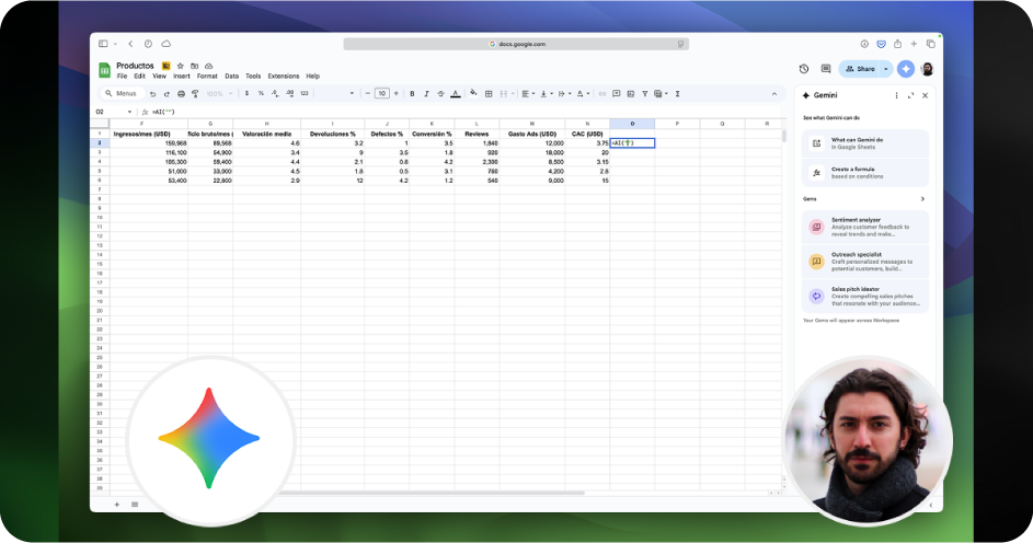 Integra fórmulas con IA que te permiten generar contenido, analizar datos y crear resultados personalizados directamente en tu hoja de cálculo con un solo comando.