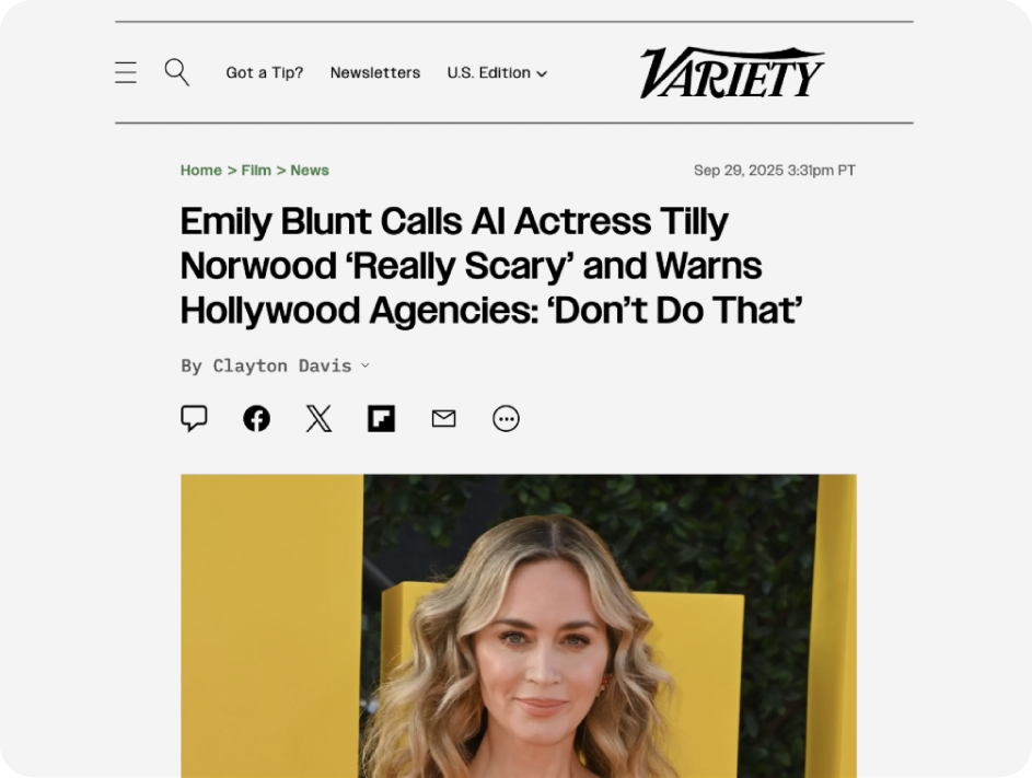 La reacción fue inmediata. SAG‑AFTRA emitió un rechazo frontal y Emily Blunt, lo calificó como inquietante y pidió a las agencias no desplazar la conexión humana.