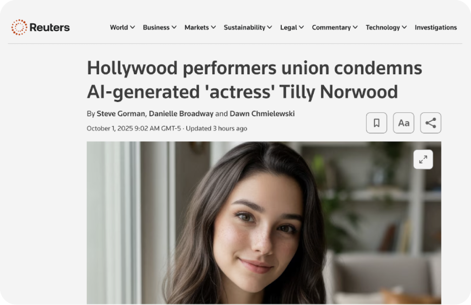 La SAG‑AFTRA marcó su posición. Tilly no es una actriz, sino un personaje sintético entrenado a partir de interpretaciones reales, sin consentimiento ni compensación. El sindicato pide salvaguardas claras con consentimiento expreso, pago correspondiente y etiquetado cuando intervenga un modelo.