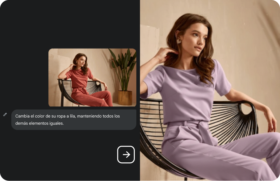 Ejemplo. “Cambia el color de su ropa a lila, manteniendo todos los demás elementos iguales.”
