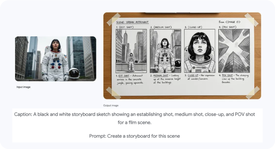 El modelo entiende narrativa, ángulos, secuencias y composición. Puedes pasarle un guion breve y te regresa un storyboard completo en segundos.