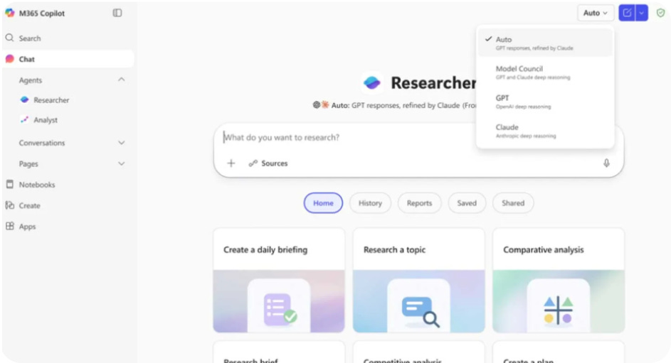 La primera se llama Critique. Ahora, cuando Copilot genera un reporte de investigación, Claude de Anthropic lo revisa automáticamente antes de entregarlo. Un modelo redacta, el otro lo destroza: evalúa la calidad de las fuentes, la completitud y la solidez de la evidencia.
