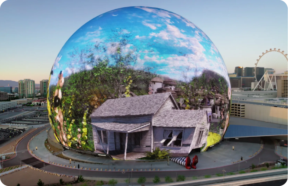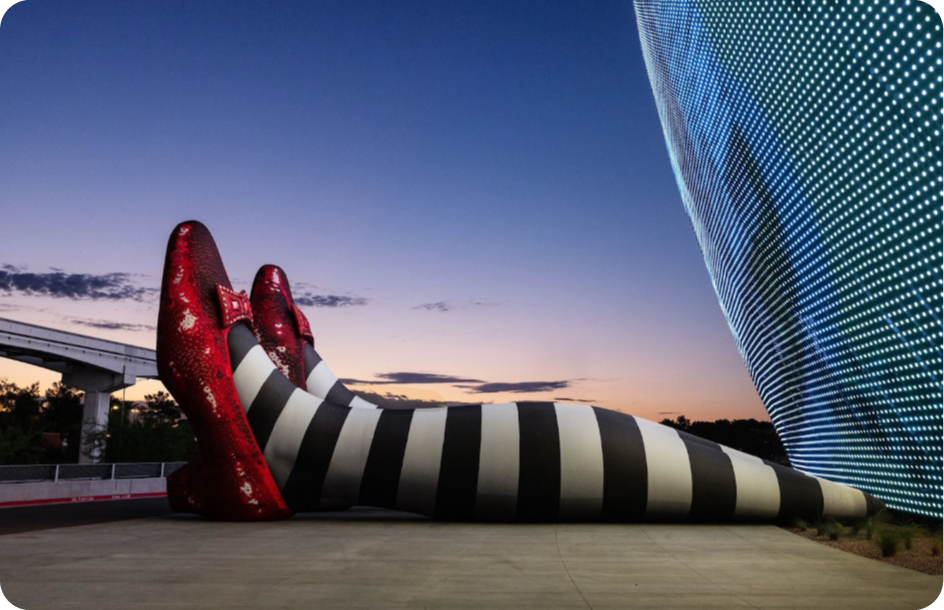 Dos piernas gigantes con zapatillas rojas saliendo de abajo del domo anuncian su nueva experiencia inmersiva de El Mago de Oz, que abre el 28 de agosto.