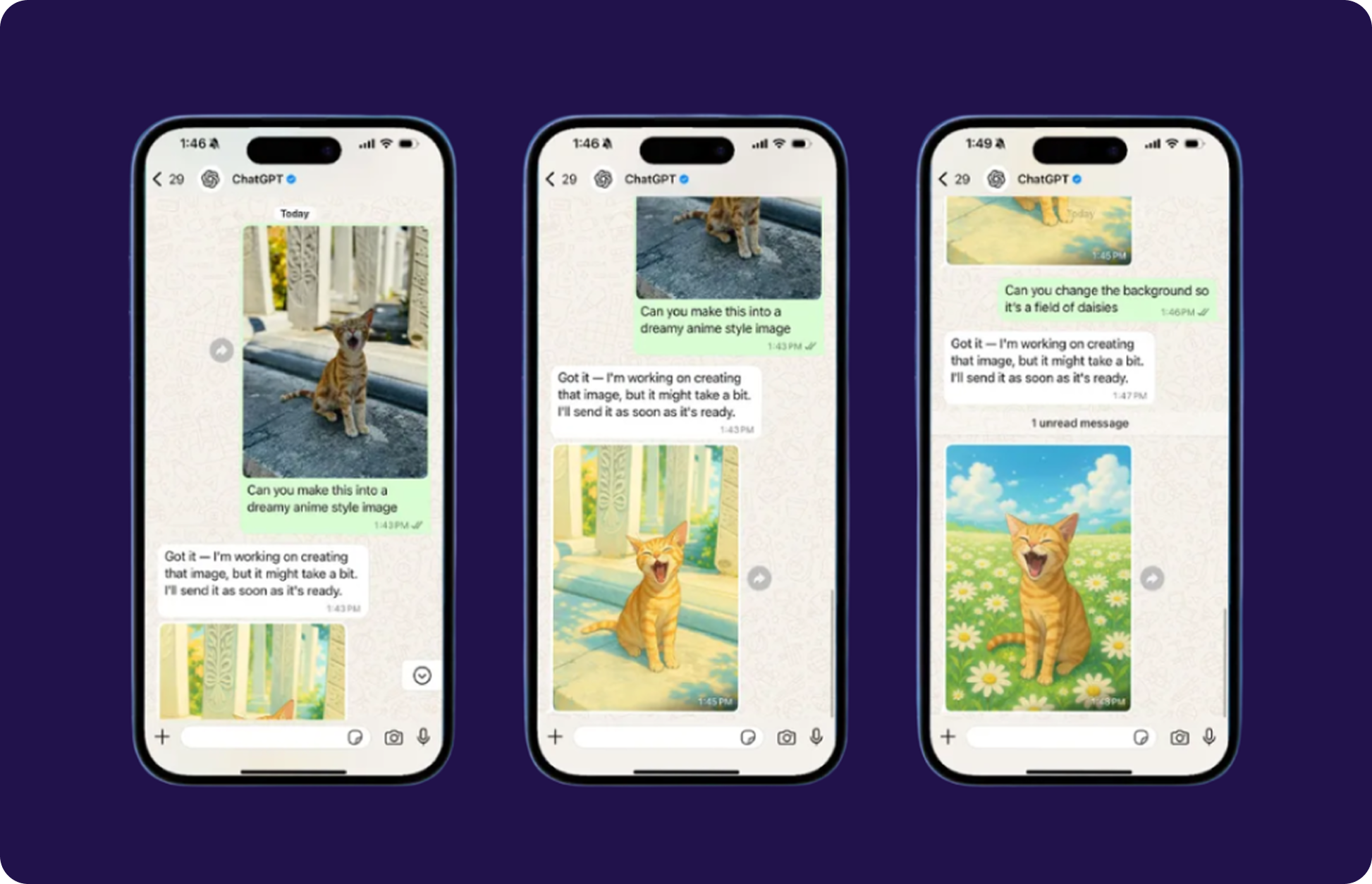 ChatGPT ya puede crear imágenes directamente desde WhatsApp. Para usarlo, debes tener el contacto oficial (1-800-ChatGPT), escribir tu prompt y listo.