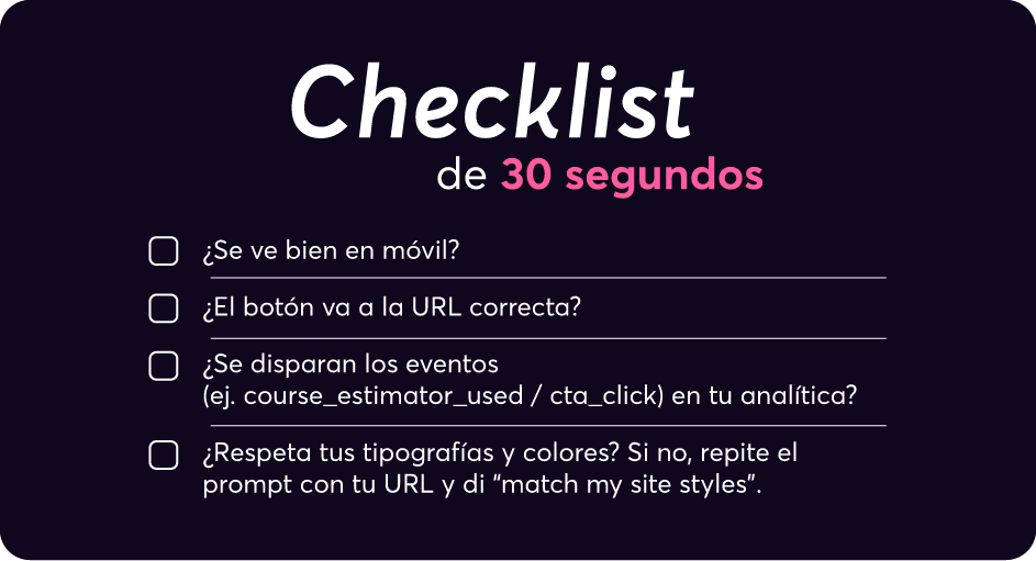 Y si prefieres no pegar el código tú mismo, no pasa nada. Igual puedes usar este flujo para validar la idea, ver cómo funcionaría en tu web y luego entregarle las instrucciones claras (y hasta el bloque generado) a tu programador. Así llegas con algo probado y reduces el riesgo de perder tiempo y dinero.